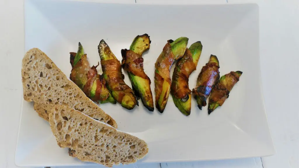 - Avocado in Steifen schneiden. (Je dünner, die mehr Streifen, je mehr Bacon wird gebraucht)Die Acocadoscheiben mit Zitrone beträufeln und kräftig würden. In den Bacon einwickeln und in einer heissen Pfanne die Seite mit den Enden des Bacons auf den Pfannenboden legen.