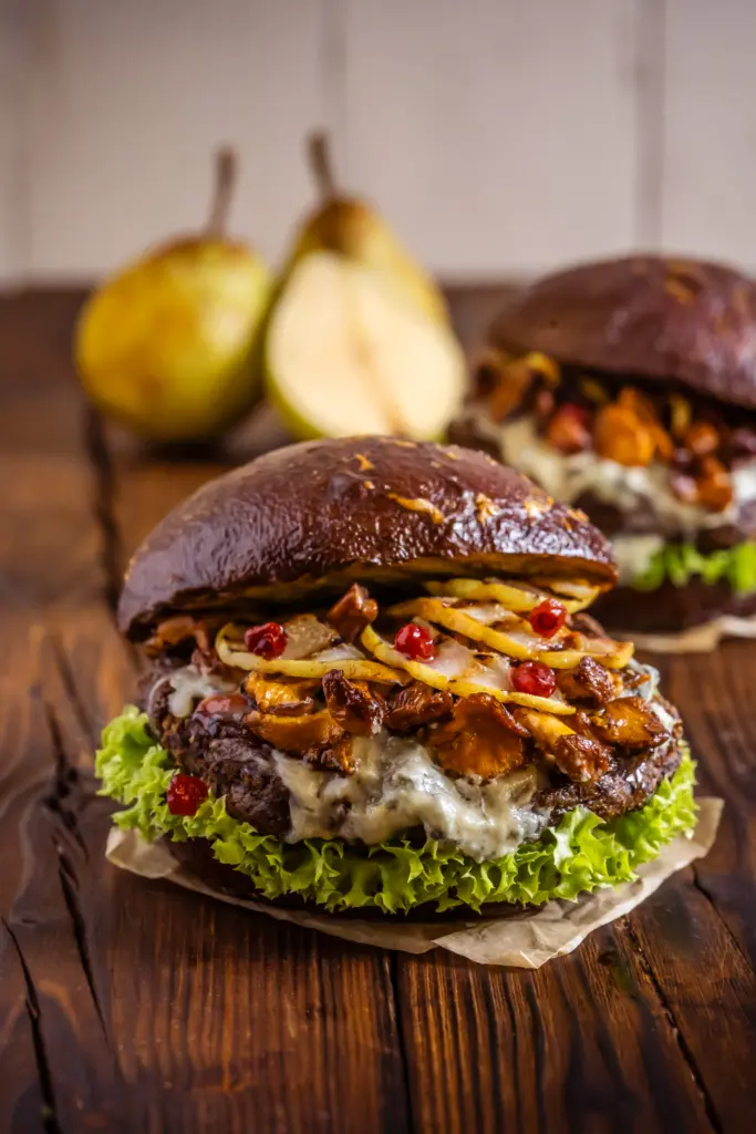- Die Pfifferlinge auf dem Käse verteilen. Das Patty mit dem Käse und den Pilzen auf das Brötchen setzen, die gegrillten Birnenscheiben darüber verteilen. Unter den Deckel des Burger Bun etwas Preiselbeermarmelade verteilen und vorsichtig auf die Zutaten legen.