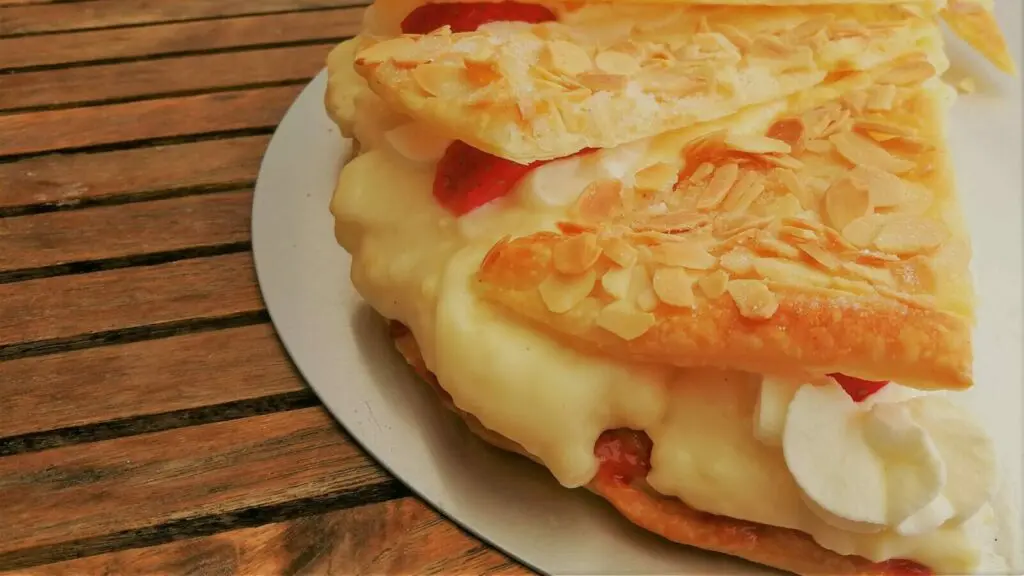 - Die restliche Sahne in einen Spritzbeutel geben und kleine Tufts auf die Masse spritzen. Wer mag kann noch mit Erdbeeren in Spalten schneiden und schräg auf die Vanillemasse setzen, sodass der Mandelblätterteig von dem Sahnetuff gehalten wird.