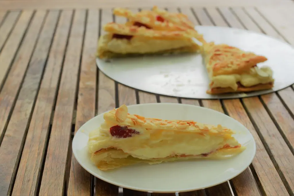 Blätterteig frisch gebacken. Eine Hälfte mit Mandeln und noch heiß geschnitten