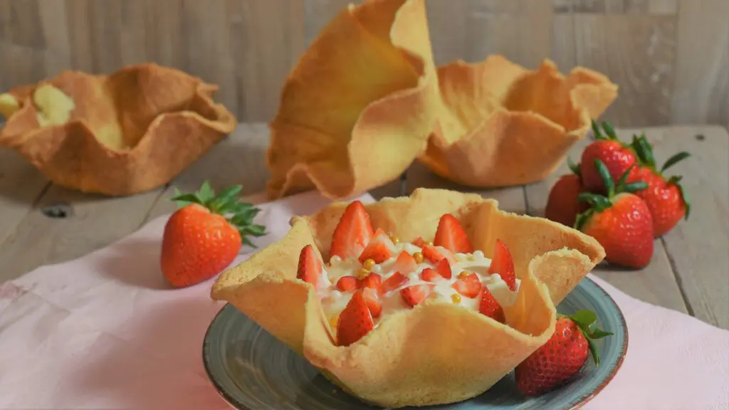 Meine Idee war es, wellige Dessertschalen aus Mandelmürbeteig zu backen und sie mit einer frischen Zitronencreme und saftigen Erdbeeren zu füllen. Entdecke mein Rezept