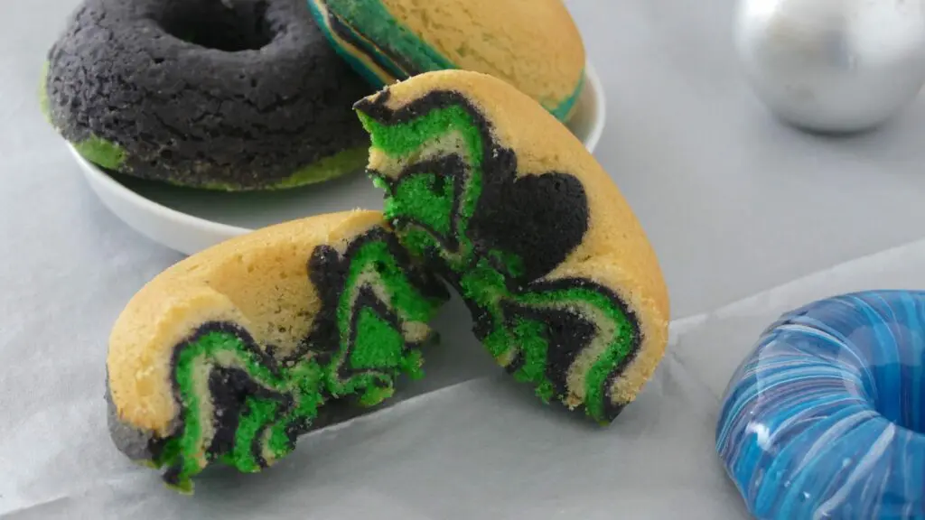 - Die Donuts-Backform ausbuttern und mehlieren. Die Farben abwechselnd in die Form füllen. Die neue Farbe immer auf die vorherige Farbe geben. Damit die Form ca. 2/3 füllen und im Backofen im unteren Drittel für ca. 15-20 MInuten backen. Kurz auskühlen lassen und wie gewünscht verzieren.