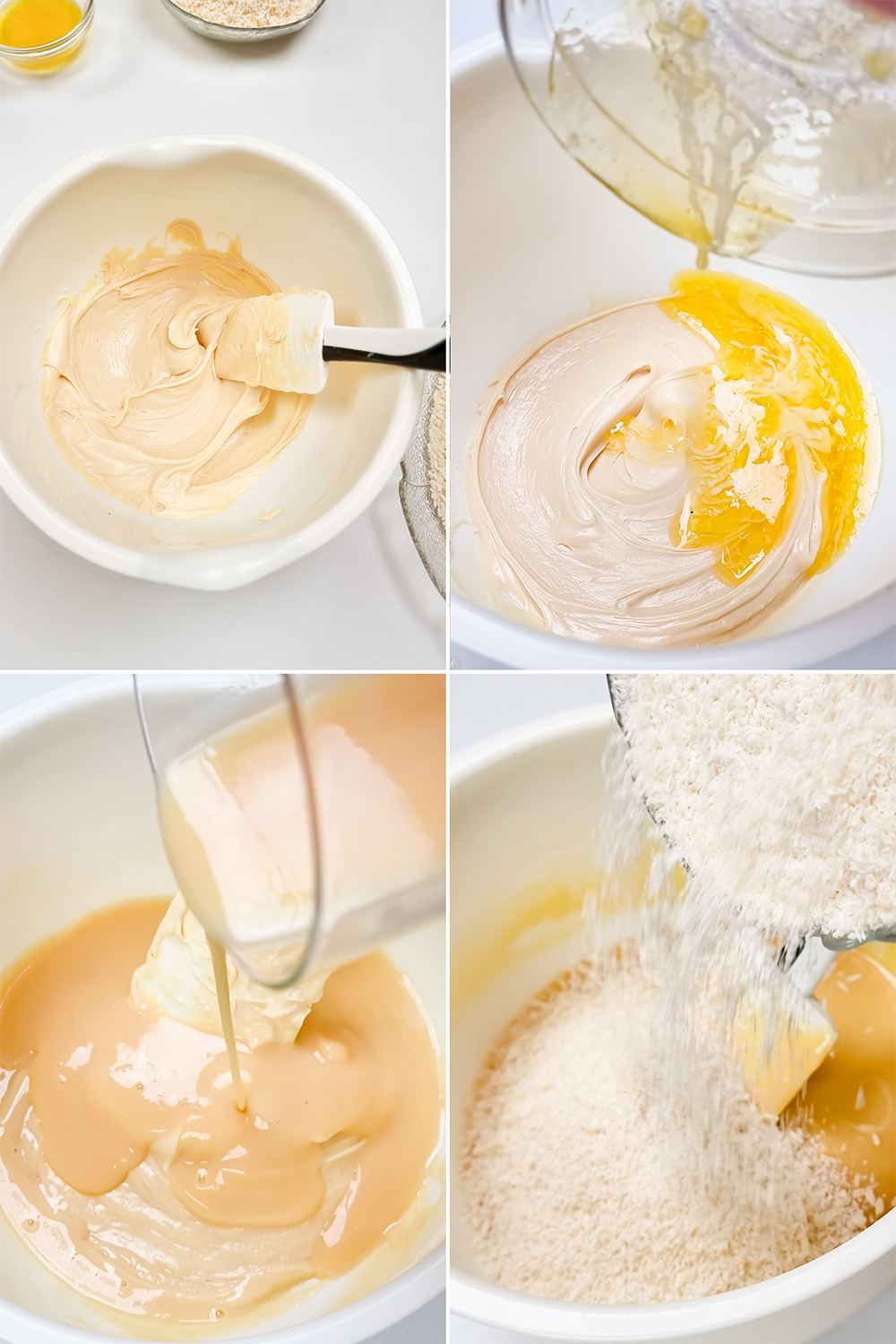 - Zum Schluß hebe ich die Kokosflocken unter. Wenn alles gut verrührt ist, kommt die Masse in eine Vorratsdose hinein. Gut verschlossen kommt die Masse in den Kühlschrank. Mindestens für 2-3 Stunden, gerne über Nacht.