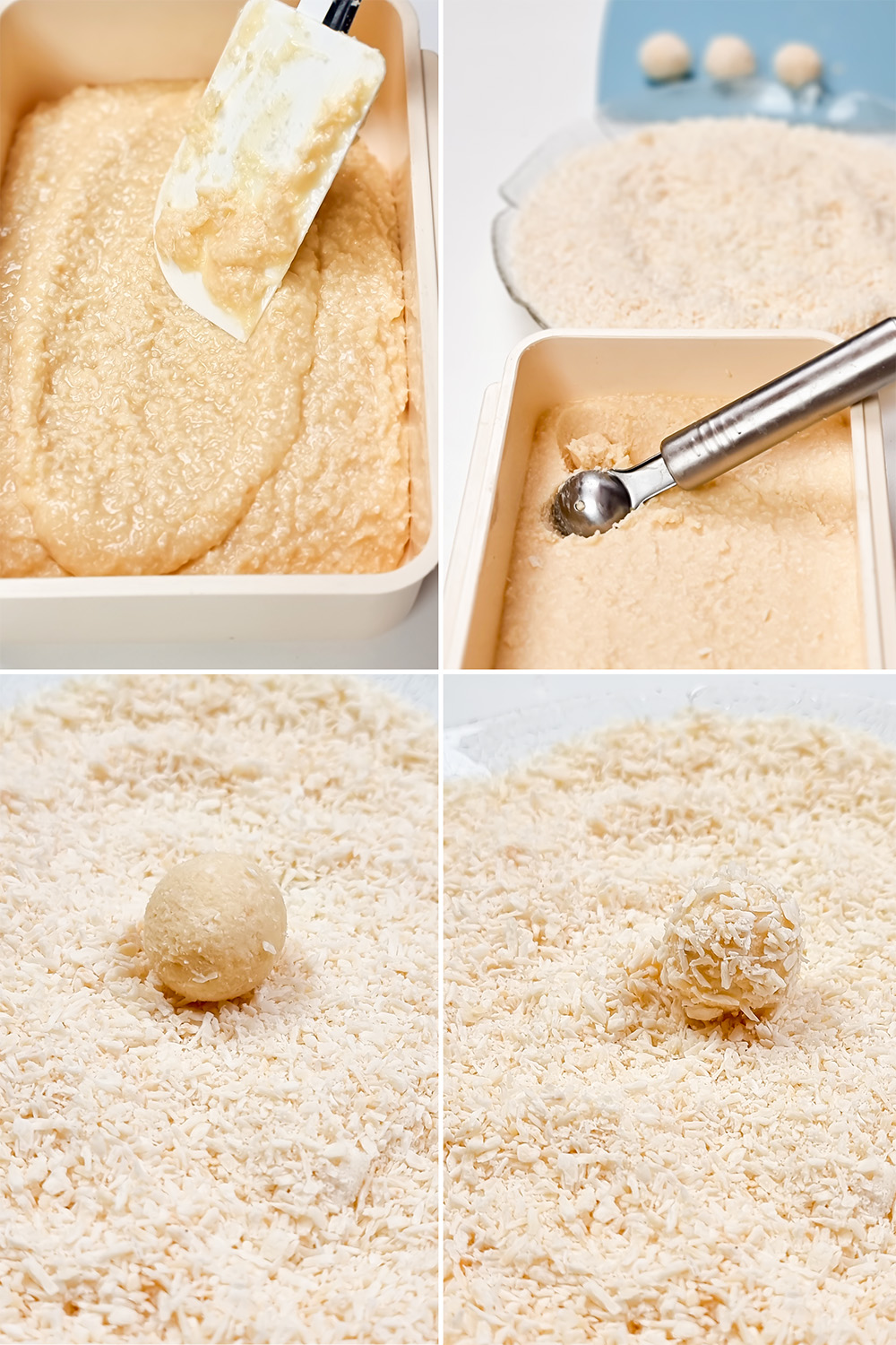 - Mit einem Melonen-Ausstecher eine kleine Menge abnehmen, mit den Händen rundformen. Die Wärme der Hände weicht die Oberfläche etwas an und somit halten die Kokosflocken perfekt. Also die Kugel in den Kokosflocken wälzen.