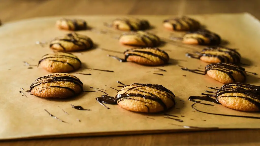 - Genügend Abstand zwischen den Klecksen lassen, da der Teig sich ausdehnt. Das Backblech im unteren Drittel des Backofens einschieben und die Temperatur auf 200°C drosseln und ca. 8-12 Minuten goldbraun backen. Vom Blech ziehen und auskühlen lassen.