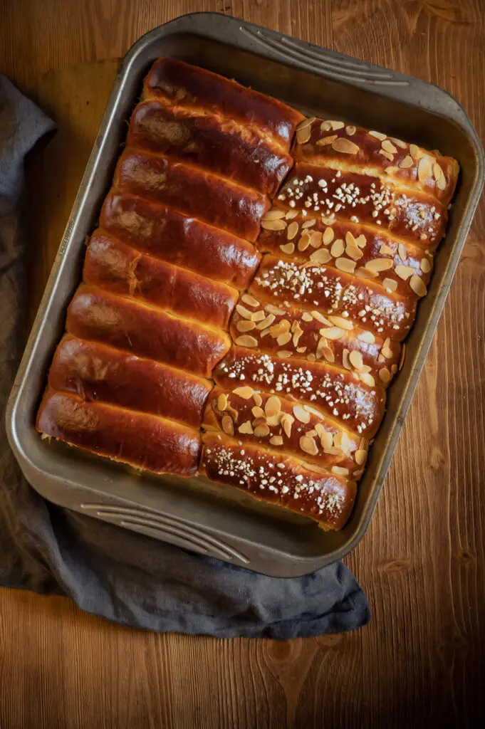 - Hagelzucker, MandelblättchenDann noch einmal bestreichen und evtl. mit Hagelzucker oder Mandelblättchen belegen.Den Backofen auf 200°C Ober-/ Unterhitze mit einer Auflaufform auf dem Boden den Backofens vorheizen. Die Teiglinge auf der mittleren Schiene in den Backofen geben. 1 Tasse Wasser in die Auflaufform schütten und ca. 15-18 Minuten backen, bis sie goldbraun sind.Hagelzucker, Mandelblättchen