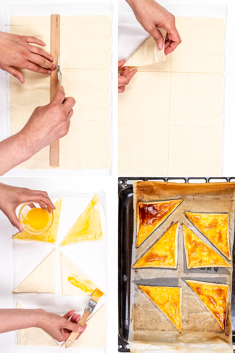 - Die sechs Blätterteig-Dreiecke auf ein Backpapier legen und mit dem Eigelb bestreichen. Im unteren Drittel für 12–15 Minuten fertig backen.1 Eigelb