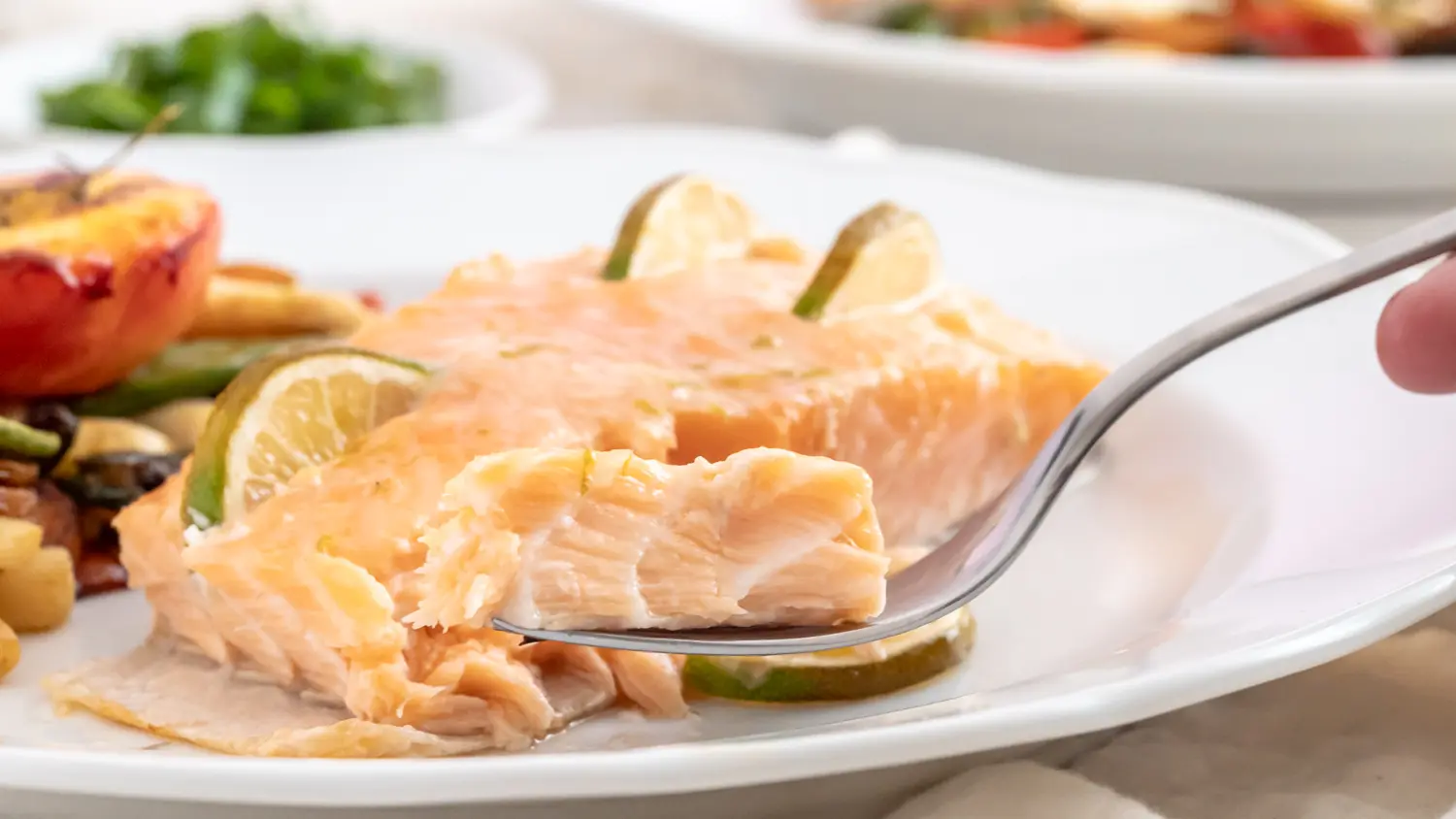 - Die Lachs-Tranche an vier Stellen einschneiden, aber nicht durchschneiden. In den Schnitt jeweils eine halbe Scheibe Limette einsetzen.