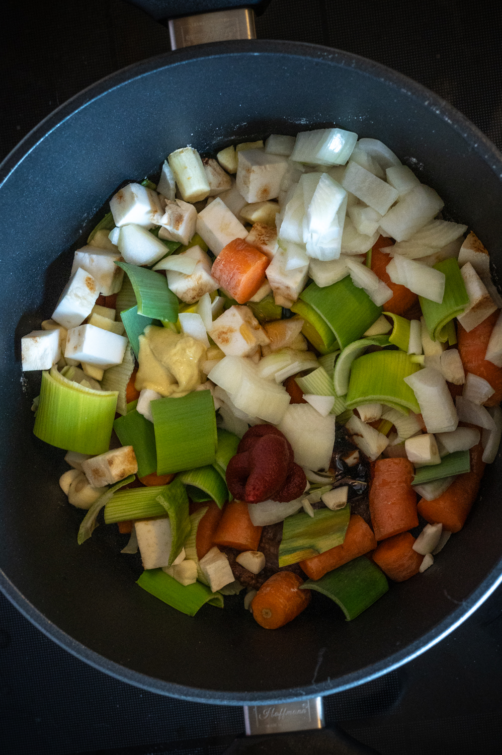 - Danach das Wurzelgemüse im gleichen Schmortopf anbraten. Senf, Tomatenmark, Balsamico-Creme und Honig dazugeben.1 EL Balsamico-Creme, 1 EL Tomatenmark, 1 EL Senf, 1 EL Honig