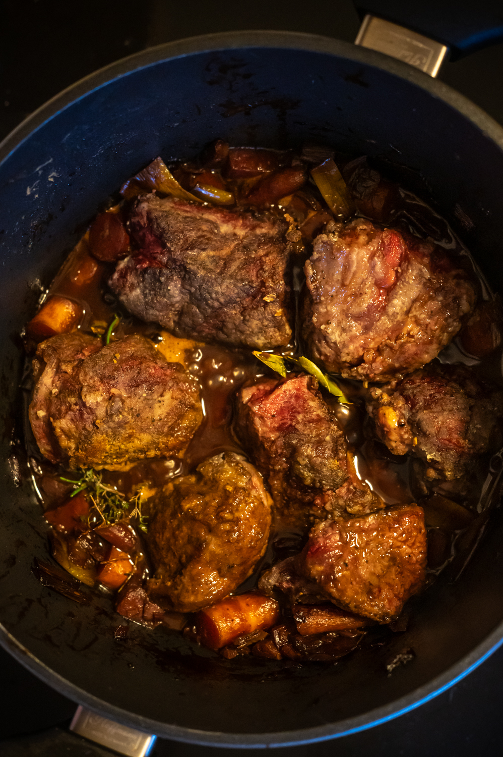 Geschmorte Ochsenbäckchen im Backofen. Ein köstliches Gericht, das man aus Stücken aus dem Kaumuskel vom Rind bereits am Tag zuvor gut vorbereiten kann. Bei dem Rezept habe ich mich an der Anleitung, in den Rindfleisch-Rezepten von Metzgerei.de orientiert. Sobald das Fleisch und das Wurzelgemüse im Topf angebraten wurden, werden Brühe und Wein nach und nach dazu gegeben. Im Schmortopf können die Ochsenbäckchen im Ofen garen. Am nächsten Tag wird nur noch die Soße passiert und die Ochsenbäckchen kurz vor dem Servieren noch einmal aufgewärmt.