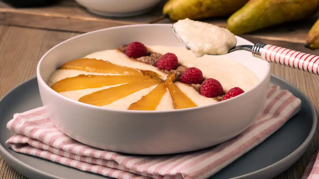 Auf den Bildern habe ich Birnenscheiben ganz kurz in Butter angebraten. Sie geben dem Grießbrei eine schöne Süße und die Birnen bekommen eine tolle Konsistenz. Ähnlich die eines gebratenen Apfels, die Du auch statt der Birne verwenden könntest. Dazu schmecken auch Rosinen, Cranberries oder Nüsse wie Mandeln, Cashew oder Walnüsse sehr gut. Auch eingeweckte Mirabellen sind dazu lecker. Jede Form von Früchten sind da wirklich sehr lecker, aber auch Zimt und Zucker ist zwar nicht gesündeste Alternative aber auch echt lecker. Ich mache gerne Vanille in den Brei und dann brauche ich dazu nichts mehr.