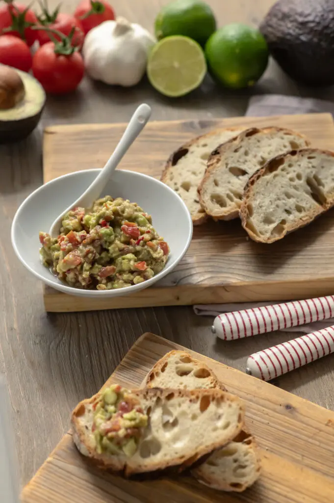 Das Ziel ist ein Brotbelag und kein Dip oder eine Sauce aus der Avocado zu machen. Deshalb bleibt sie auch so fein gewürfelt, genauso wie die Tomate. Die Cremigkeit entsteht beim Verrühren der ganzen Zutaten, wenn die Avocado schön reif ist. Die Avocado ist für mich wie eine pflanzliche Butter und so setze ich sie auch gerne ein. Auf dem Brot oder Baguette erzeugt die Guacamole mit Tomate sein volles und cremiges Mundgefühl mit einer Extraportion Frische durch die Tomate.