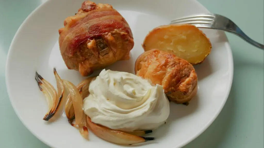 - Die Kartoffeln eine Auflaufform setzen, mit dem Baconscheibenende nach unten. Im Backofen für 15 Minuten gratinieren.