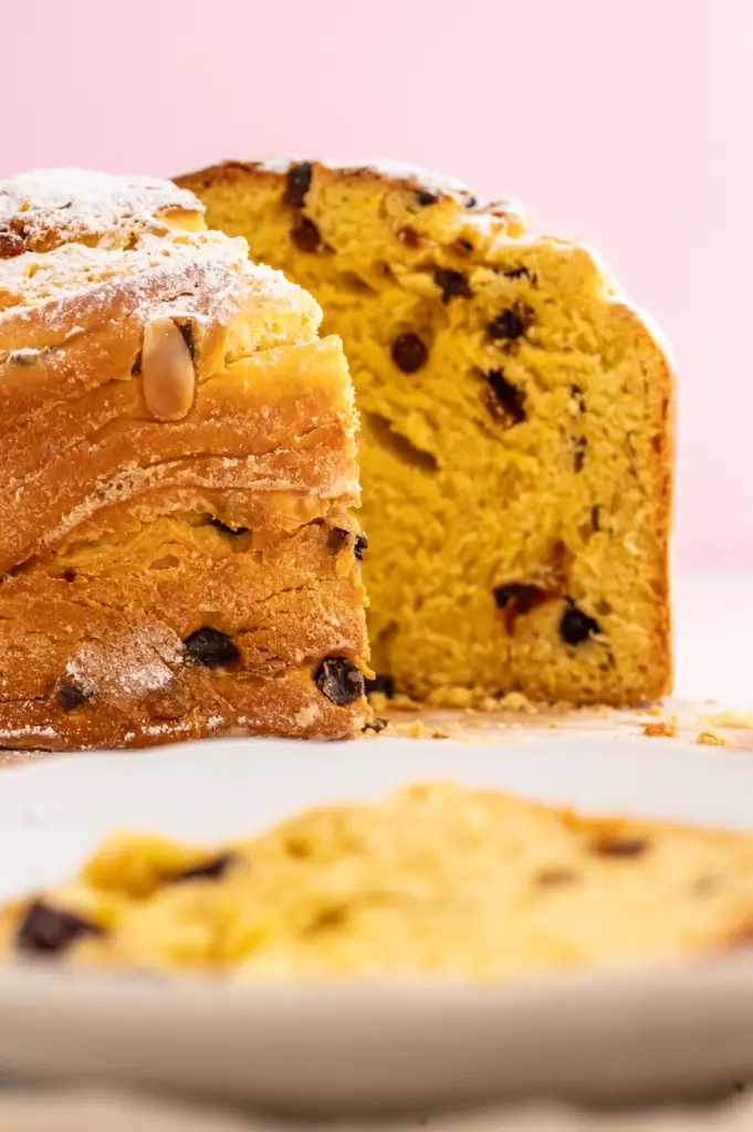 Der Kraffin wird üblicherweise verschieden gefüllt, mit Rosinen, Cranberrys, Aprikosen oder kandierten Früchten. Ganz neu war für mich, dass dem Hefeteig-Rezept statt Milch auch ein Orangensaft oder auch Maracuja-Saft zugesetzt werden kann. Das macht den Hefezopf fruchtiger im Geschmack, was obendrein noch eine vollkommen neue und spannende Variante eines Hefezopfs ergibt! Der Hefezopf ohne flechten wird deshalb auch leichter Pannetone genannt, weil er genuso luftig leicht schmeckt wie die italienische Backware.