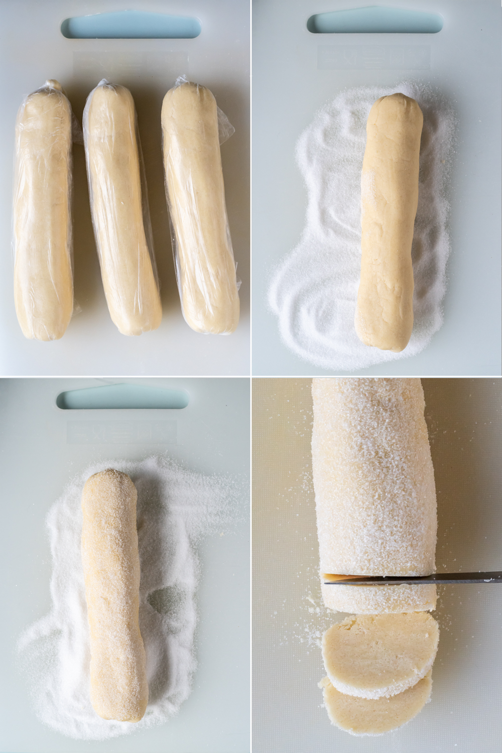 - Den Teig aus dem Kühlschrank holen und Rollen von 2cm Durchmesser herstellen. Anschließend in Zucker wälzen und noch einmal für 30 Minuten kühl stellen.In der Zwischenzeit den Backofen auf 180°C Ober-/Unterhitze vorheizen und das Backblech mit Backpapier auslegen.