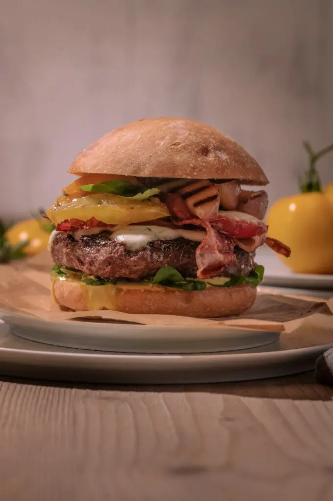 Burger Bun Italian Style, Knoblauch-Kurkuma Mayonnaise mit Kräutern, Feldsalat, Wagyu-Rind Pattie 200 g, drei Pancetta Streifen, Mozzarella, Tomate „Limonnij Gigant“, Tomate „Sgt. Pepper“ und gegrillte Pfirsich-Schnitze. Vereinzelt auf die Tomaten kleine Mozzarella Stücke.