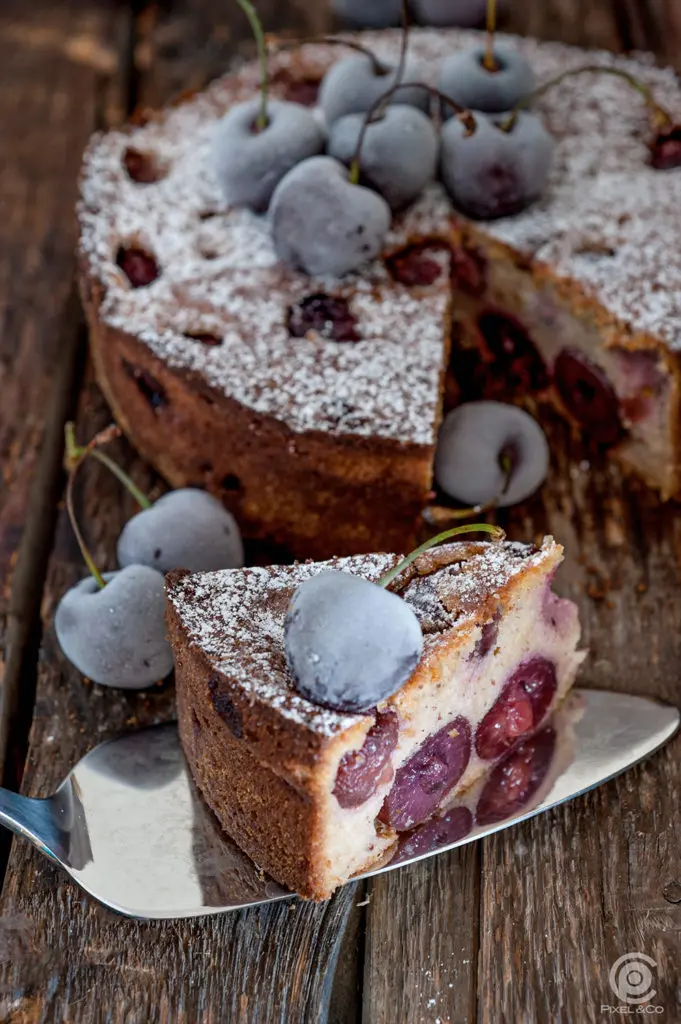 Ich serviere ihn gerne mit Puderzucker, oder mit Vanillesoße, Schlagsahne oder einer Kugel Vanilleeis schmeckt er auch mega lecker. Am liebsten natürlich pur, mit ganzen Kirschen. Für das Shooting haben wir gefrorene Kirschen auf den Kuchen gesetzt. Wenn Dir das gefällt wäre das natürlich eine weitere Möglichkeit.