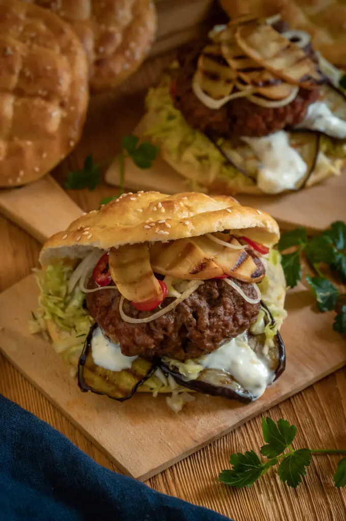 - Die Mini-Fladenbrote aufschneiden, sodass eine Tasche entsteht. Den Krautsalat auf dem Boden verteilen. Die Aubergine darüber. Ordentlich mit Joghurtsoße bedecken. Das Patty auf die Auberginen legen und mit Zwiebel- und Chili-Ringen garnieren. Die Apfelscheiben auf die Zwiebel legen. Zupacken, reinbeißen.