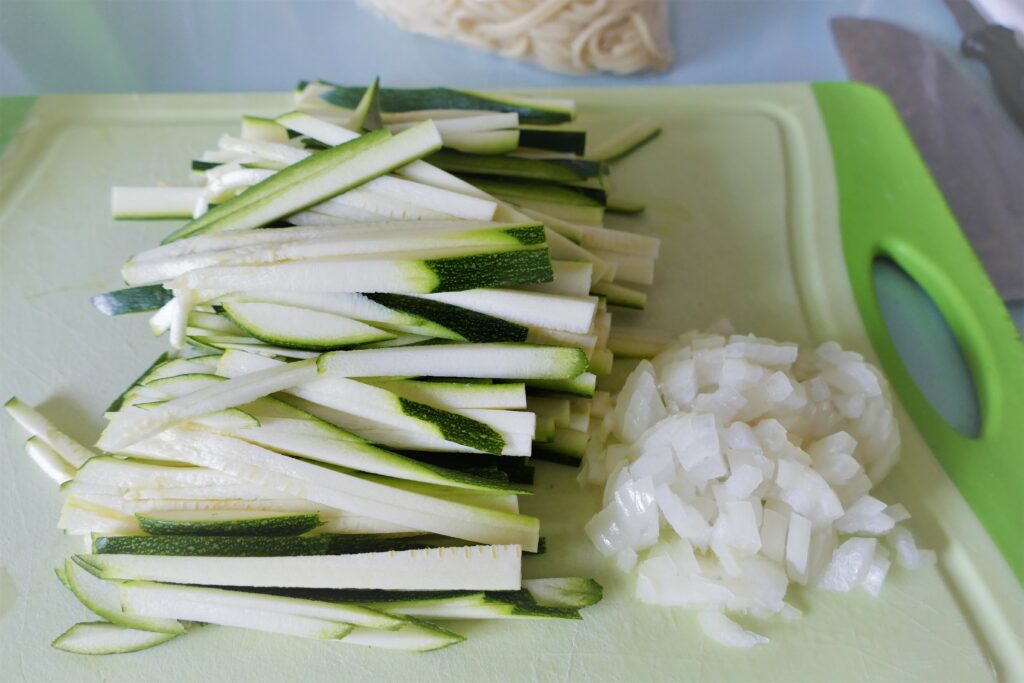 - Die gekochten Nudeln aus dem Kühlschrank holen.Den Strunk der Zucchini abtrennen. Der Länge nach in dünne Scheiben schneiden. Die Scheiben der Länge nach halbieren und in Streifen schneiden.