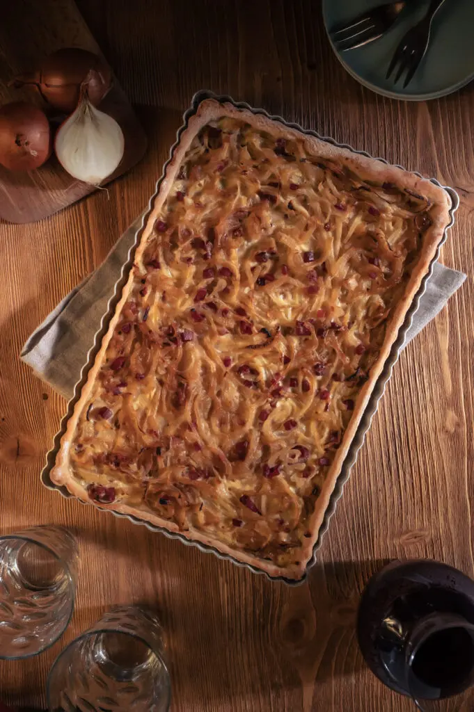- Den Zwiebelkuchen im unteren Drittel des Backofens einschieben und die Temperatur auf 200°C Ober-/Unterhitz drosseln, für 30-35 Minuten goldbraun backen. 5 Minuten abkühlen lassen und noch warm servieren.