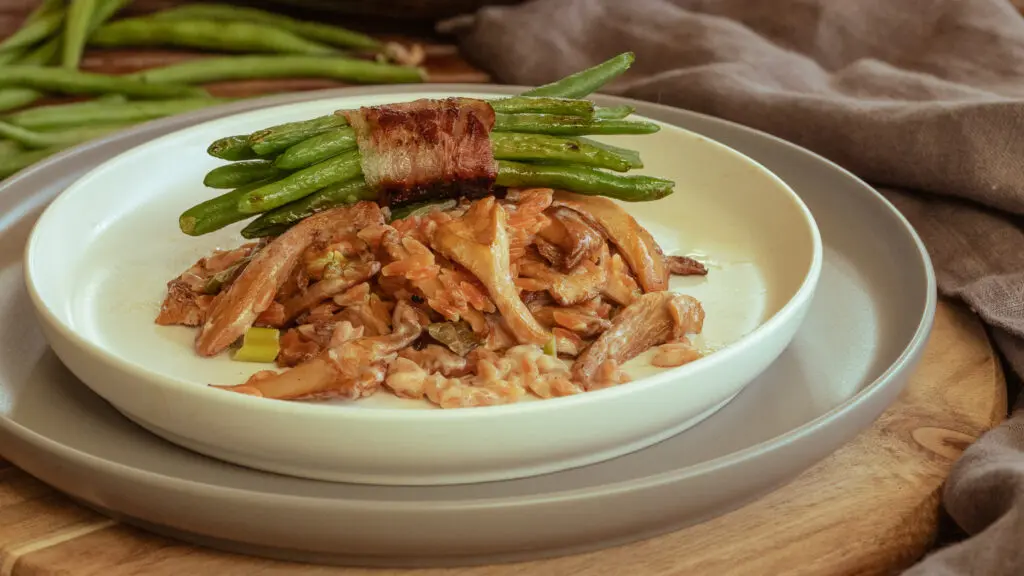 Pilze sind das ganze Jahr unser Star in der Küche. Der Pfifferling mit seinem würzige, leicht pfeffrigen Geschmack passt hervorragend zu Pasta aller Art. Dieses Mal bereiten wir zügig Pfifferlinge mit Nudelrisotto und Speckbohnen zu. Mit Kritharaki-Nudeln geht’s flott, lecker und ehrlich – ein glutenfreier Genuss, der leicht von der Hand geht!