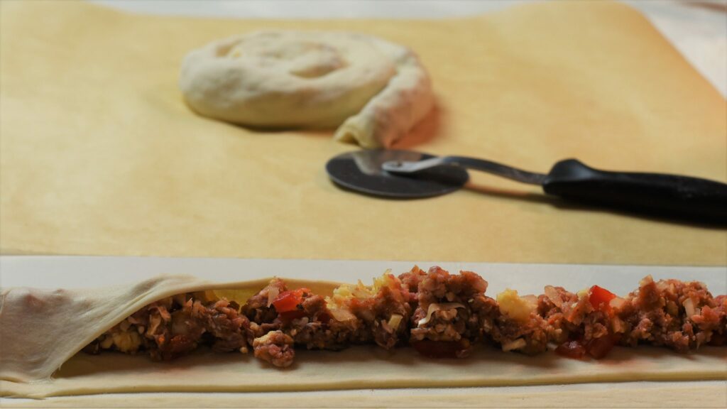 - Den Teig länglich ca. 2 mm dünn ausrollen. Den Teigstrang mit einem Pizzaschneider in 7–8 cm breite Streifen schneiden. Jeweils in die Mitte der Teigstreifen etwas von der Füllung setzen und einen Rand lassen. Den Teigstreifen auf der ganzen Länge zur Mitte hin zusammenfalten und fest zusammen drücken. So wird der Teig mit Füllung ähnlich einem Schlauch.