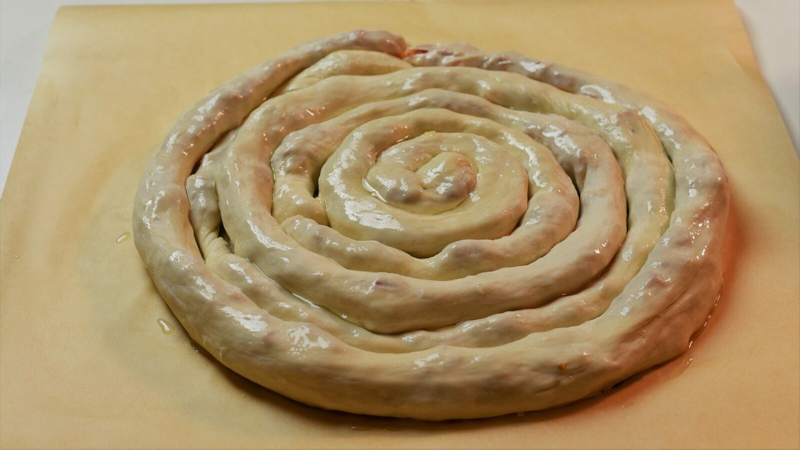 - Ein Backblech mit Backpapier belegen. Die gefüllten Teigstränge mit der verschlossenen Seite nach unten auf das Backpapier legen und locker zu einer Pizzaschnecke aufrollen.Allen Teigstreifen weiter um die Schnecke wickeln. So entsteht eine große Pizzaschnecke. Mit Olivenöl bepinseln und die Schnecke 20 Minuten ruhen lassen.