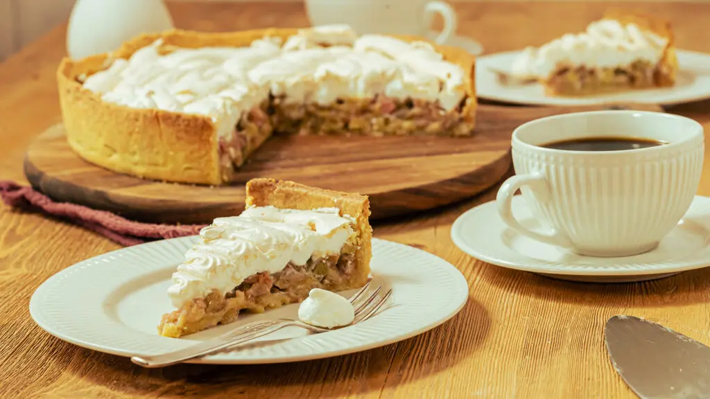 Die Füllung des Rhabarberbaiser Kuchen besteht aus Rhabarberstücken, geschlagenem Eiweiß mit Zucker, dem Baiser.