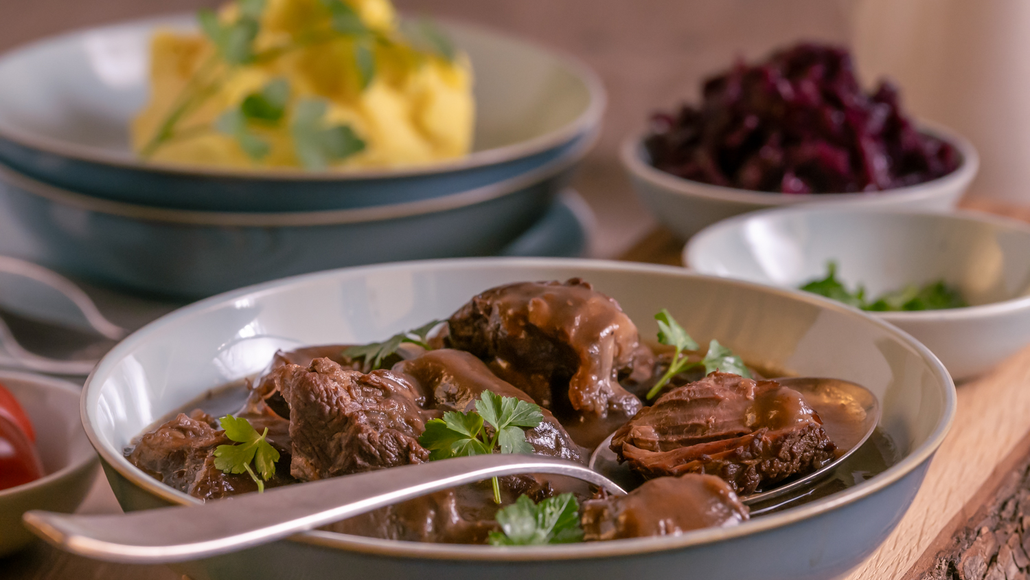 Heute mache ich das Schmorgericht immer noch in einem großen, gusseisernen Topf. Jedoch reicht die Menge für drei bis vier Portionen, die größten teils eingefroren wird. Für den ersten Teller Gulasch des Jahres richten wir uns mit schönen Beilagen an. Besonders beliebt ist dabei ein cremiger, warmer Kartoffelbrei und ein selbst gemachtes Apfelrotkraut. Alternativ kommen natürlich noch weitere Kohlsorten in Betracht, wie unser Rahmwirsing und ein gedämpfter Brokkoli.
