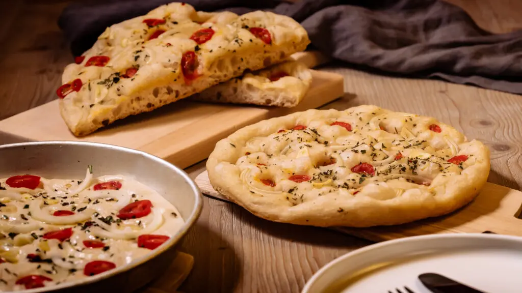 - Tomaten, Zwiebel, Knoblauch nach belieben auf der Focaccia verteilen.