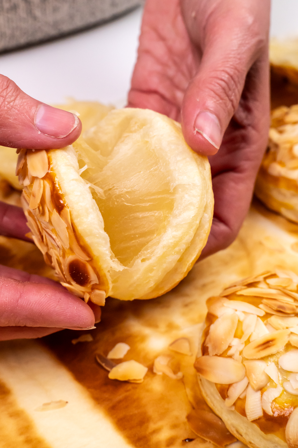 - Nach dem Backen, die zwei Blätterteig-Schichten noch warm auseinander ziehen und komplett auskühlen lassen.