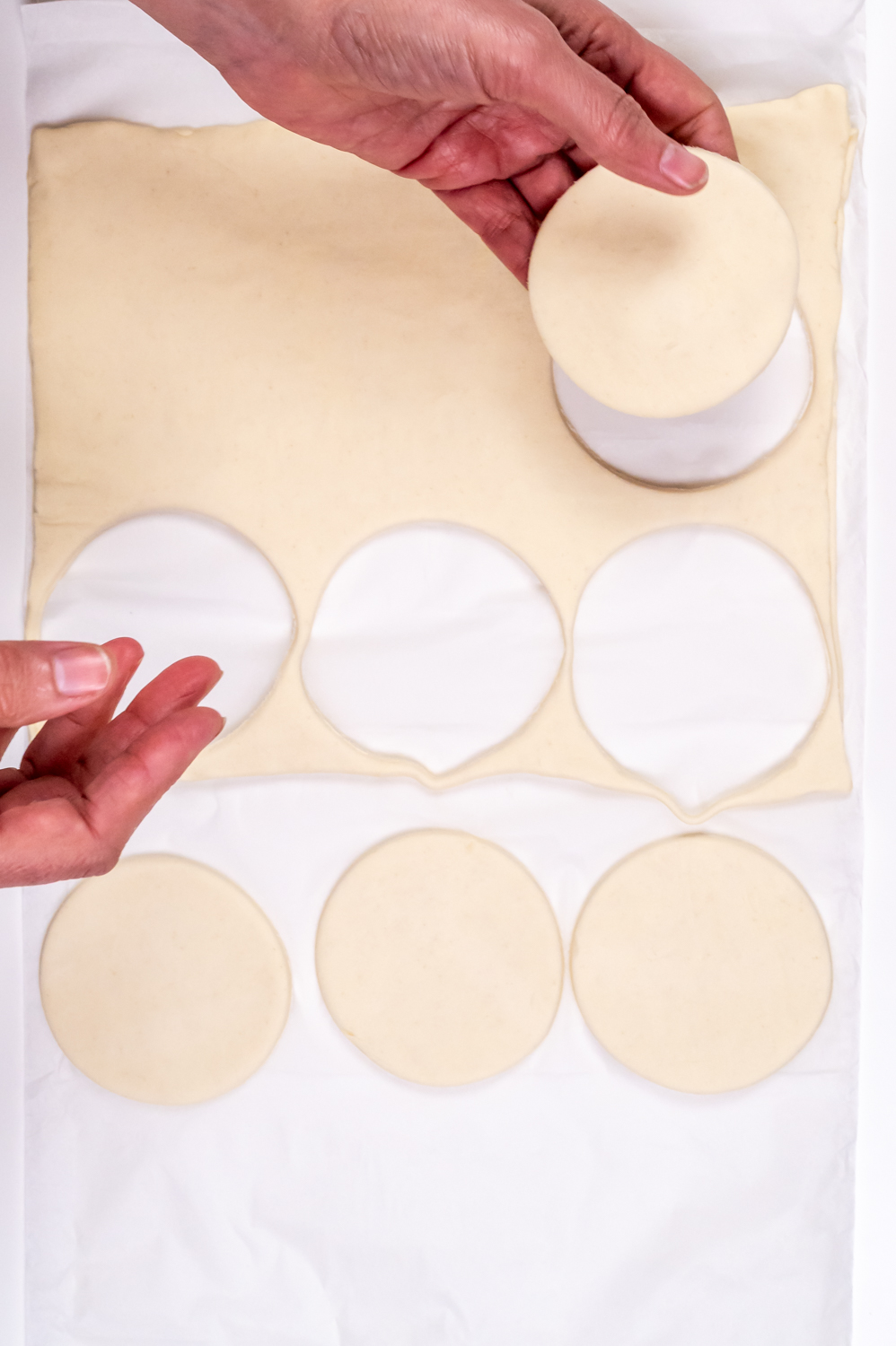 - Mit einem runden Dessertring je 6 Kreise ausstechen. Mit Eigelb bepinseln. Anschließend mit den Mandelblättchen bestreuen.