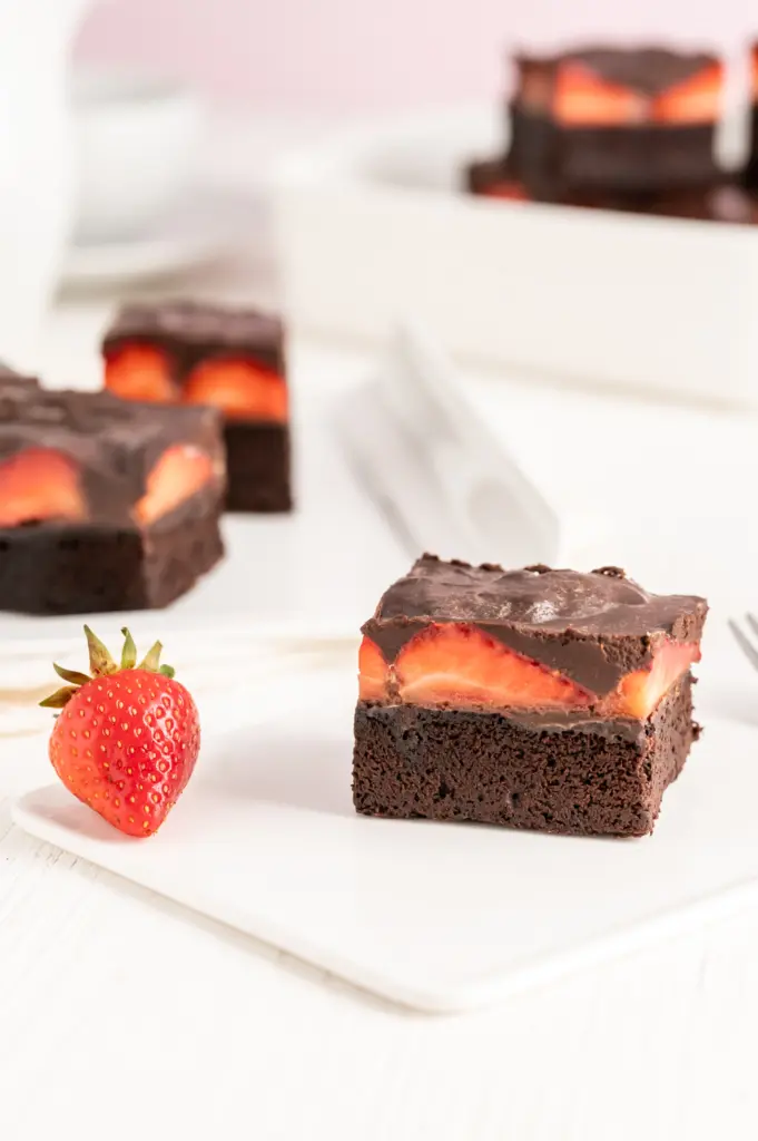 Die Ganache komplett abkühlen und fest werden lassen. Danach die Tortenrandfolie entfernen und die Schoko-Brownies mit Erdbeeren in gleichmäßige Stücke aufschneiden. Ich habe 5x5cm große Brownies geschnitten, es geht aber auch jedes andere Maß, so wie du es magst.