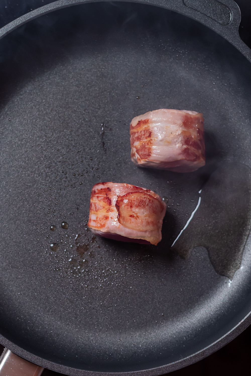 - Filetstücke mit Speck:Dann die Filetstücke mit dem Speckende / Speckverschluß direkt auf den Pfannenboden geben, sodaß das Speckende mit dem restlichen Speckstreifen in der Hitze verschmilzt. Die Filetstücke ringsrum anbraten. Weiter dann wie mit den "Filetstücke ohne Speck"