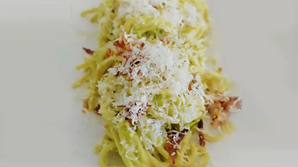 Auf einem Teller geben und den Bacon darüber Bröseln. Mit frisch geriebenen Parmesan servieren oder gleich über die Nudeln reiben.
