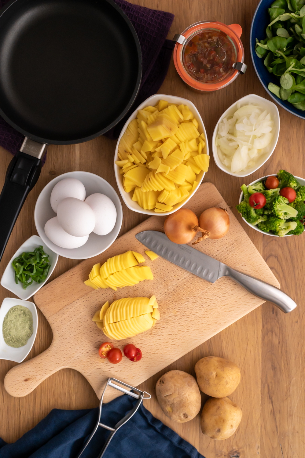 Das Omelette mit Kartoffeln kann ich, sobald alle Zutaten vorbereitet sind, sich selbst überlassen. Die rohen Kartoffeln habe ich dazu geschält, geviertelt und in dünne Scheiben geschnitten. Die Zwiebeln ebenso. Dazu kommt eine kleine Menge Brokkoli-Röschen und Cherry-Tomaten, die ich in ihrer Größe anpasse. Etwas Frühlingszwiebeln dürfen bei mir nicht fehlen. Sobald die Kartoffeln mit den Zwiebeln in der Pfanne garen und zusammen für das typische Aroma sorgen, bereite ich mir noch einen Salat vor und hole eine meiner eingemachten Tomaten-Paprika Salsa für das Topping dazu.