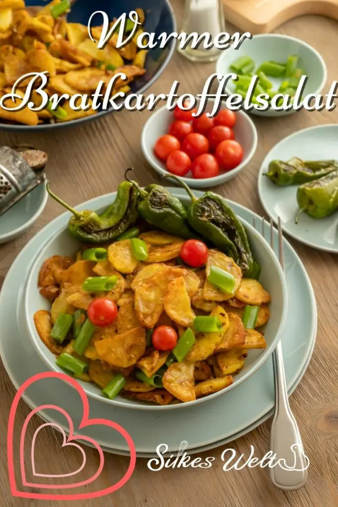 - Die Bratkartoffeln in eine große Schüssel geben, die Bratkartoffelsalat-Sauce darüber gießen und mit dem geschnittenen Frühlingszwiebeln garnieren. Den Bratkartoffelsalat 5 Minuten ziehen lassen und noch warm servieren.Guten Appetit wünscht Rezepte-Silkeswelt.de