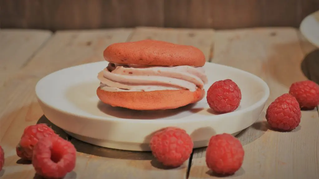 - Die Sahne aufschlagen aber nicht ganz fest. Etwas von der Sahne zu dem gelierenden Himbeerpüree geben um die Temperatur anzugleichen. Dann das Himbeerpüree unter die Sahne schlagen. In einen Spritzbeutel mit der Tülle Deiner Wahl füllen und auf einer Hälfte des Woopie spritzen und mit einem zweiten, gleichgroßen Woopie bedecken (wie bei einem Macaron). Im Kühlschrank aufbewahren.