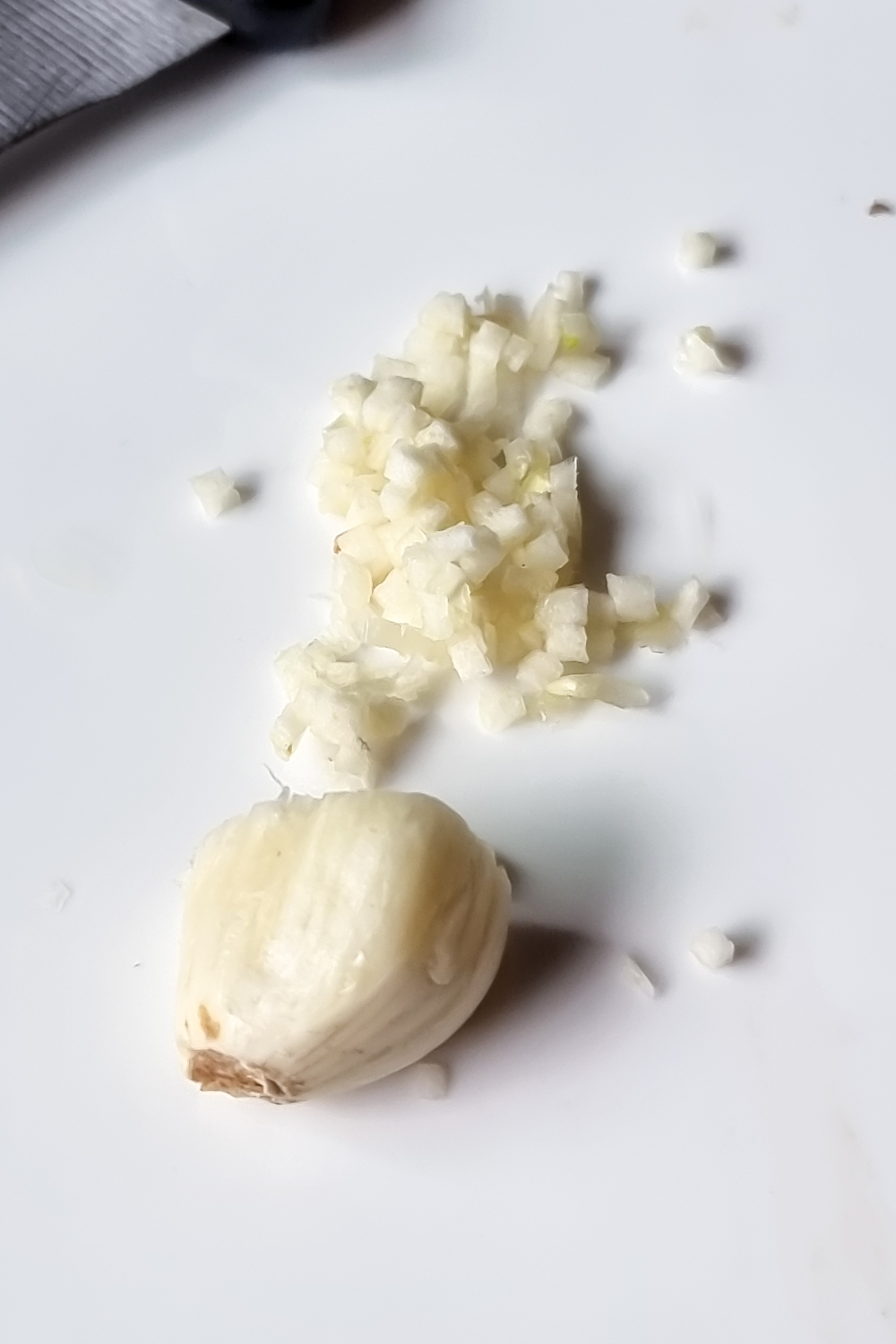 Den Knoblauch schälen und fein würfeln. Dazu die Knoblauchzehe zum Wurzelansatz hin in schmalen Abständen längs einschneiden. Nicht durchschneiden. Die Knoblauchzehe um 90° drehen und längs einschneiden.Quer zur Schnittrichtung die Knoblauchzehe in feine Würfel schneiden.