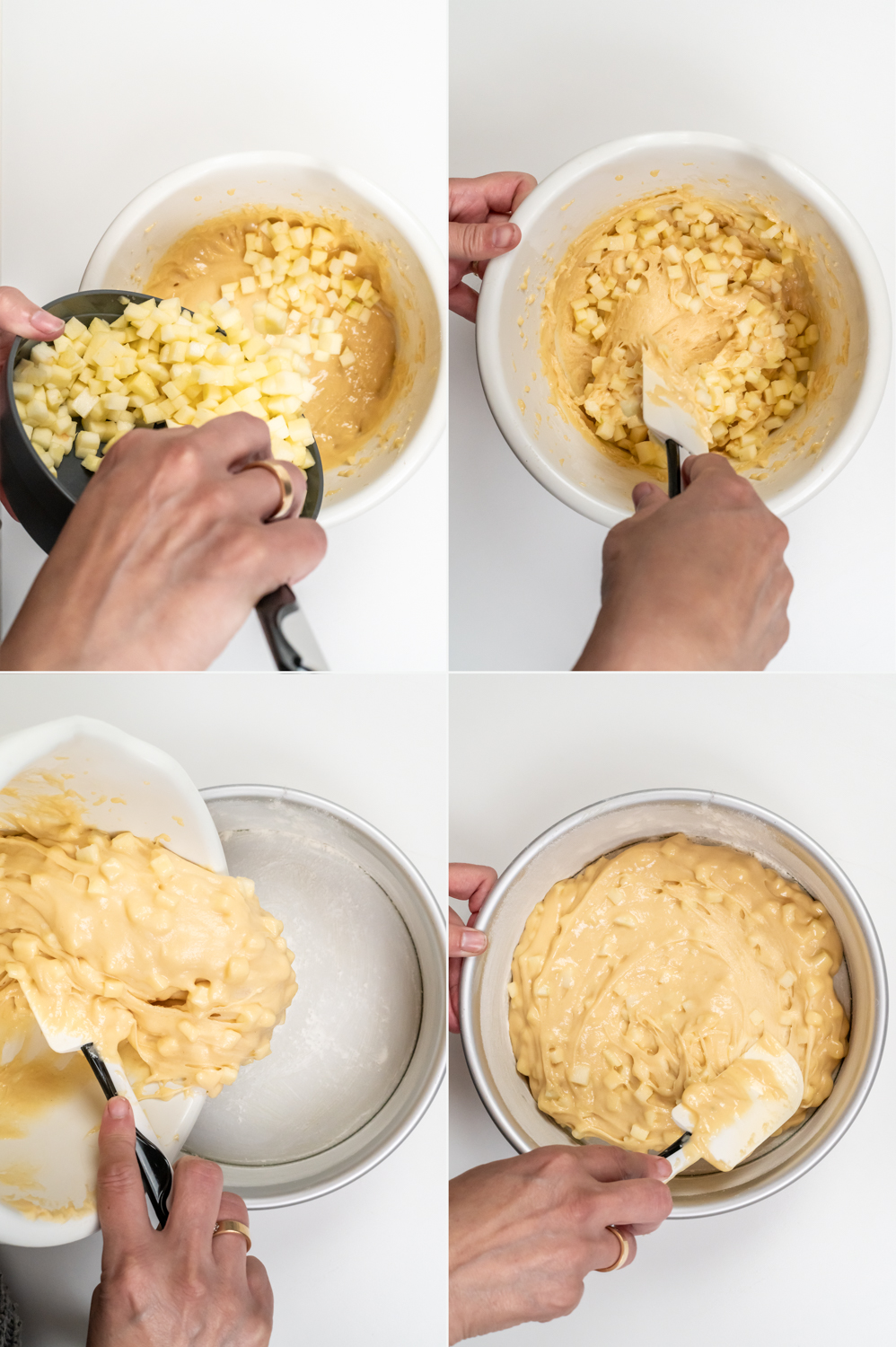 Die gewürfelten Äpfel vorsichtig unter den Teig mischen. Den Kuchenteig in die 22 cm große Kuchenform geben und gleichmäßig verteilen. Glatt streichen