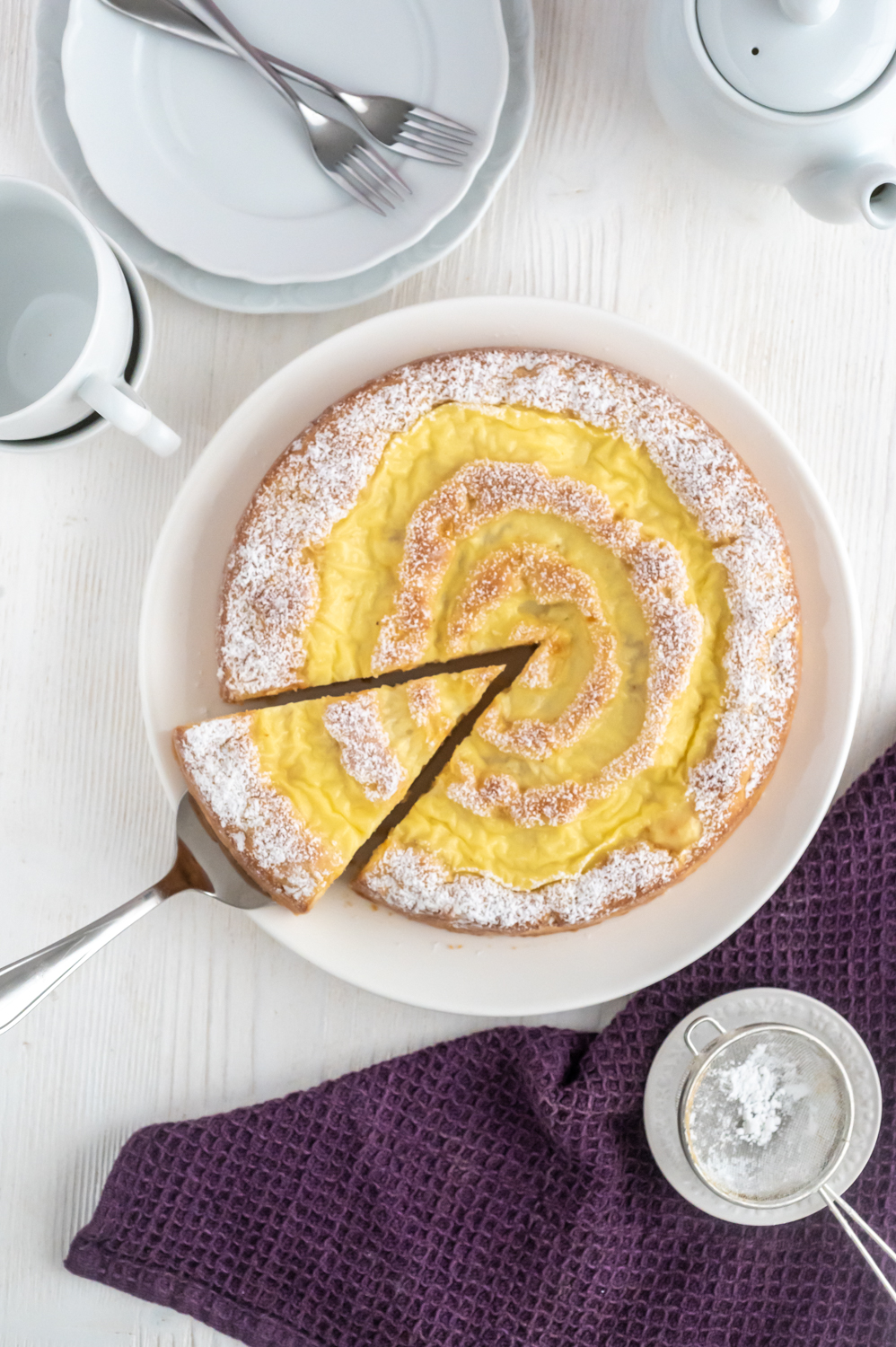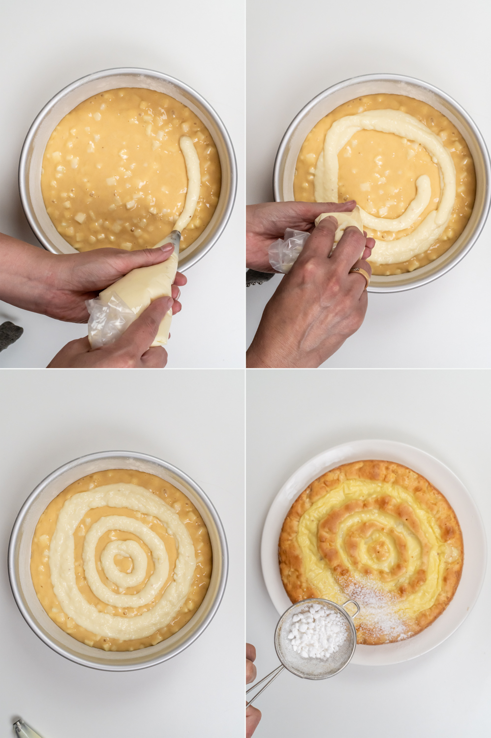 Den abgekühlten Pudding, der eine feste Konsistenz haben sollte, in einen Spritzbeutel mit Lochtülle füllen. Den Pudding in mehreren geschlossenen Kreisen über dem Kuchenteig mit Äpfeln verteilen und so für ein schönes Muster sorgen.