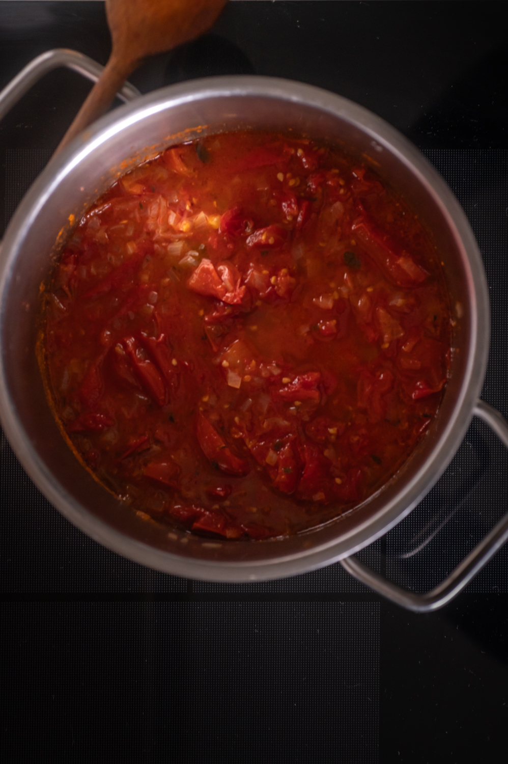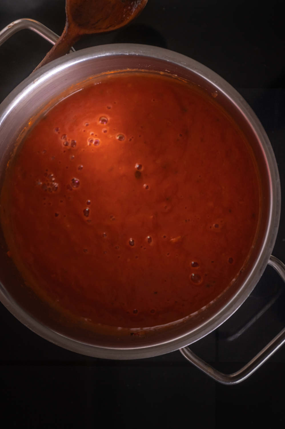 Einen Esslöffel Pflanzenöl in einen Topf geben und bei mittlerer Hitze die Zwiebel glasig dünsten. Dann den Knoblauch dazu geben. Sobald die Zwiebeln leicht braun werden die Tomaten und die Gewürze (Rosmarin, Oregano, Zucker und Chillischote) dazu geben.