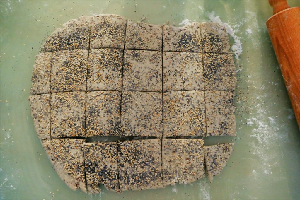 Am nächsten Morgen den Teig aus dem Kühlschrank holen und gut 2-3 cm dick (rechteckig) ausrollen. Den Backofen auf 250-275°C Ober-/Unterhitze vorheizen (incl. Backblech / Pizzastein). Sesam mit dem Mohn in einem Schälchen mischen.Die Sonnenblumenkerne großflächig auf den Teig streuen und fest drücken. Den Teig umdrehen und mit der Sesammischung bestreuen.