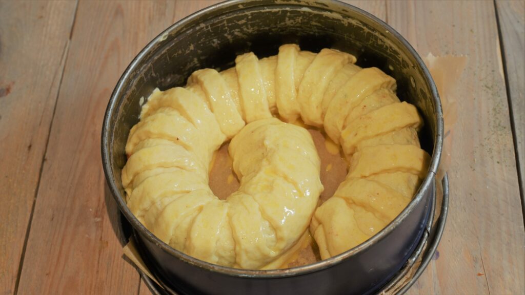 Nun den Teig von der langen Seite, der Füllung aufrollen. So entsteht das schöne Muster. Eine mit Backpapier ausgelegte Springform bereitlegen. Den Teig locker zu einer Schnecke aufrollen, in die Form geben. Es sollte noch genug Platz sein, dass der Teig noch etwas aufgehen kann.