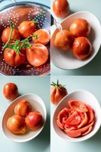 Tomaten kreuzweise eingeschnitten, indem man mit einem scharfen Messer eine X-förmige Kerbe in die Unterseite der Tomate ritzt. Die Tomaten in eine Schüssel geben und mit kochendem Wasser aus dem Wasserkocher übergießen.