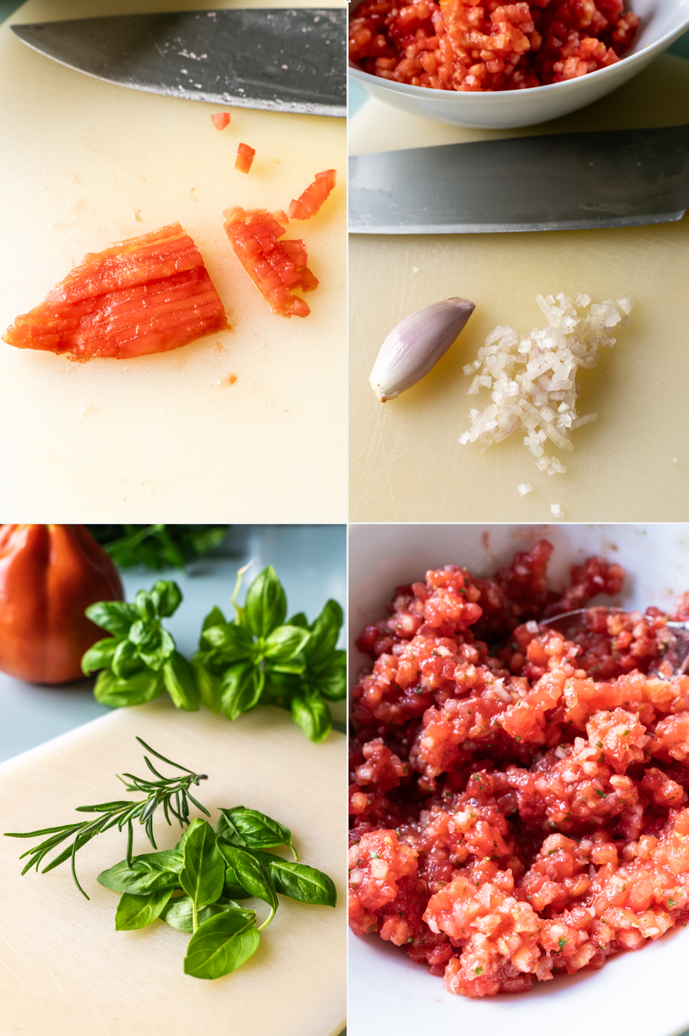 Das Tomatenwasser abschütten und für Pasta. Saucen und Salate verwenden. Tomaten-Concassée in die Schüssel geben, fein gehackte Kräutern und Kapern dazu geben. Mit Olivenöl und Himbeeressig übergießen. Alles gut vermischen und mit Tabasco Sauce abschmecken.